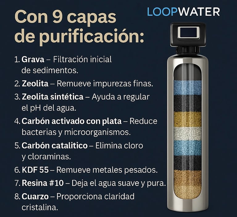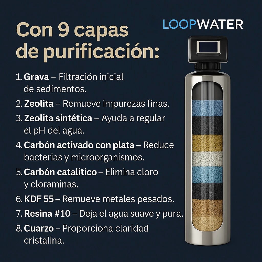 Transforma la calidad del agua de tu casa con nuestro sistema Loopwater, diseñado para ofrecerte agua más limpia, suave y segura desde cada grifo. Incluye: